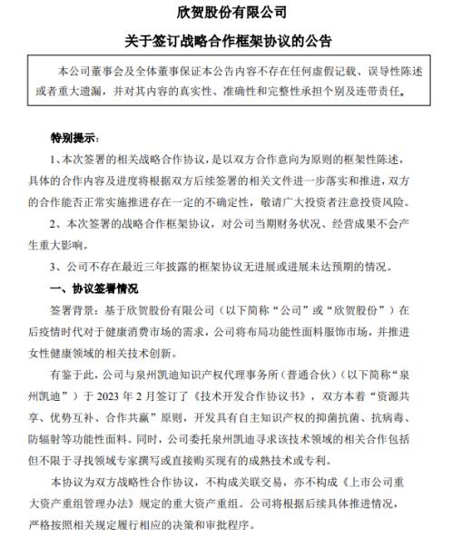 来源:欣贺股份关于签订战略合作框架协议的公告