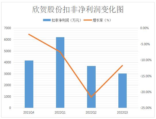 近期,欣贺股份主业表现乏力,2021年四季度起,其扣非净利润连续四季度降低,从2021年四季度到2022年三季度,公司分别实现扣非净利润4180万元、6215万元、3699万元、3021万元,同比分别下降1.95%、7.44%、21.62%、11.74%。